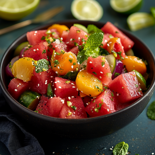 Instructions: Prepare the Salad: In a large mixing bowl, combine the watermelon cubes, strawberries, blueberries, cucumber, and orange segments (if using). Gently toss to combine. Sprinkle the chopped fresh mint …